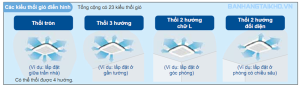 Lưu ý: Một kiểu mặt nạ được sử dụng đồng nhất cho tất cả các kiểu thổi gió. Ngoài kiểu lắp đặt thổi tròn, cần sử dụng tấm chắn miệng thổi gió (phụ kiện tùy chọn) cho tất cả các kiểu còn lại để đóng các miệng gió không sử dụng. Độ ồn gia tăng khi sử dụng thổi 2 hướng hoặc 3 hướng.