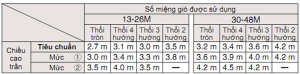 Tiêu chuẩn cho độ cao trần và số miệng gió: (Chiều cao trần là giá trị tham khảo)