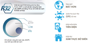 Hiện nay, Gas R32 là môi chất lạnh mới nhất hiệu suất làm lạnh cao hơn và thân thiện hơn với môi trường so với các môi chất trước đó R22, R410a.