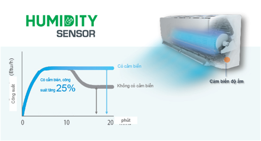 Cảm biến độ ẩm Humidity sensor đây chính là tính năng mới của điều hòa Daikin inverter 9000 BTU FTHF25XVMV hơn hẳn model trước đó giúp cho khả năng khử ẩm nhanh hơn & làm lạnh nhanh hơn 25% so với điều hòa thông thường. Nhờ đó mà duy trì cảm giác thoải mái dễ chịu hơn.