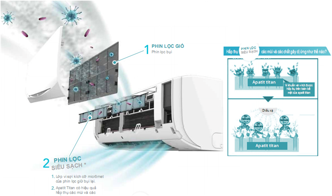 Một trong những ưu điểm nổi bật của máy điều hòa Daikin FTHF25XVMV là công nghệ khử khuẩn hiện đại. Daikin là 1 thương hiệu luôn rất chú tâm đến chăm sóc và bảo vệ sức khỏe người dùng. ở điều hòa Daikin 2 chiều inverter 9000BTU FTHF25XVMV người dùng sẽ được trải nghiệm một công nghệ diệt khuẩn khử mùi bằng vật liệu mới – Apatit Titan vật liệu xúc tác quang tiên tiến với khả năng hấp thụ vượt trội và tiêu diệt bụi bẩn, mùi hôi một cách hiệu quả. Tuổi thọ của phin lọc lên tới 3 năm nếu được sử lý vệ sinh thường xuyên.