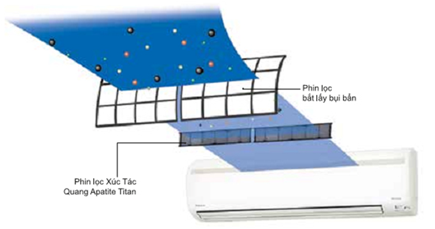 Apatit Titan là vật liệu xúc tác quang cao cấp với khả năng hấp thụ vượt trội. Khi bụi bẩn được hút vào phin lọc, Apatit Titan sẽ hấp thu và loại bỏ mùi hôi và bụi bẩn một cách hiệu quả. Tinh lọc không khí bằng xúc tác quang là công nghệ khử mùi và diệt khuẩn. Daikin là công ty đầu tiên áp dụng xúc tác quang cho các loại phin lọc không khí sử dụng cho các máy lọc không khí dân dụng. Thành công của Daikin đã giúp các nhà sản xuất trong nhiều ngành nghề ứng dụng công nghệ này vào các sản phẩm diệt khuẩn.