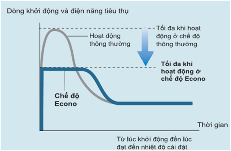 Chức năng này hạ chế dòng khởi động và điện năng tiêu thụ hoạt động ở mức tối đa. Nó sẽ đặc biệt hiệu quả khi có nhu cầu tải quá lớn như khi mới khởi động máy, nới đông người, phòng tiếp xúc nhiều ánh nắng. Chức năng Econo còn có tác dụng ngăn ngừa CB quá tải tại những thời điểm tải làm lạnh / sưởi lớn tạm thời. Dễ dàng kích hoạt chức năng này từ bộ điều khiển qua việc nhấn nút Econo.